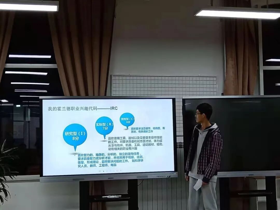 第三位分享的是张译霖同学。从起初对人生规划的逃避,认为这样隐私的东西不必也不该拿出来和别人分享到现在能够用积极的态度制作PPT并有勇气站在大家面前,她意识到分享是一种见证,也是一种感染,用别人的见证督促自己继续努力,用自己的规划感染同学继续努力,也不错。译霖同学分析了自己性格的优点和缺点,并自我笃定所谓优点在将来也许是缺点比如理性,所谓缺点却也会是某些情境下的优点比如自闭。所以她对自己的规划也用了四个字:随性而为。这里不是随便地做出一份作业交给老师,交给自己,而是在竭尽努力的前提下,没有一个固定的非他不可的目标,相信只要有兴趣,有爱好,有渴望,有梦想,就一定会在极度努力后有一个目标在前方等着自己。