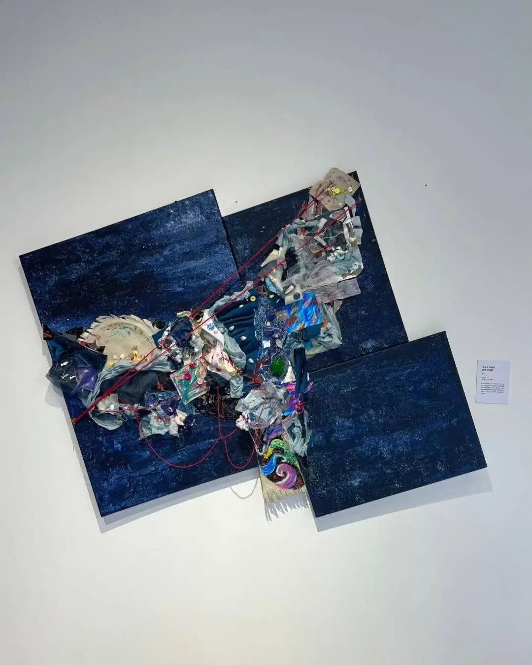 在作品《红》的创作过程中,王老师教我们在画布上保留材料历经时间的质感,教我们如何利用身边废弃的纸张制作海浪的肌理,又如何令毛线在装置上像血丝蔓延也如射线警示,那些被赋予新生的材料不再只是堆叠于画布之上,它们开始呼吸,开始用镜子碎片中观众的身影来唤醒观众。