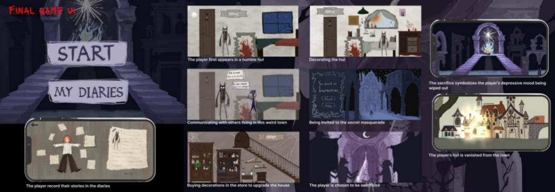 故事的最后,人们发现了一对抱在一起的遗骸,可一碰,两人都化作灰尘随风而去。世上总有些东西高于生命,卡西莫多一生生活在阴影之下,而他对光明与爱的强烈向往使他选择殉情。网络上的发疯文学中也从不忌讳谈论死亡,死亡在被提及时往往表现的是想从不顺心的生活中逃离。所以,我在游戏中为这个诞生于负面情绪的角色设计的结局是在祭坛中结束生命,同时房子也会消失。我想通过献祭这个角色来视觉化人们对摧毁负面情绪的情感需求和对美好生活的渴望,角色的死亡与生活痕迹的消散在这里并不是结束,而是开始,是消散了糟糕情绪的新生活的开始。如果能帮助玩家在这个游戏的剧情中释放负面情绪并拥抱自我的脆弱面,我会感到我做的一切都是有意义的。