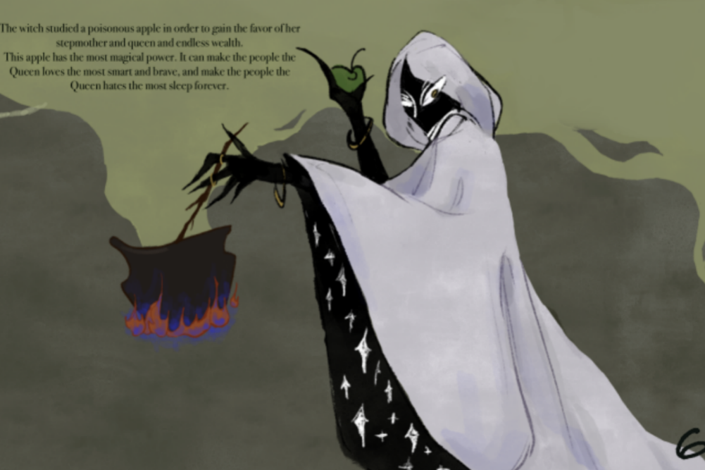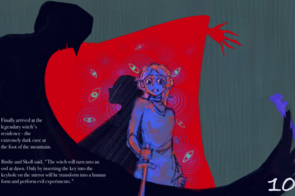 十一年级的冬天,在学业和作品集都最繁忙的时段,我与小组成员在CTB竞赛中埋首于画稿与论文之间,将《白雪公主》改写——那个因美貌得名的公主,如今叫作"Skoll",在古语里意为"勇敢"。她不再等待王子与婚戒,而是握紧剑柄,在丛林中开辟自己的路。我们画她刀剑的光影、染尘的双手,画她如一棵树自由生长,而非被修剪的玫瑰。