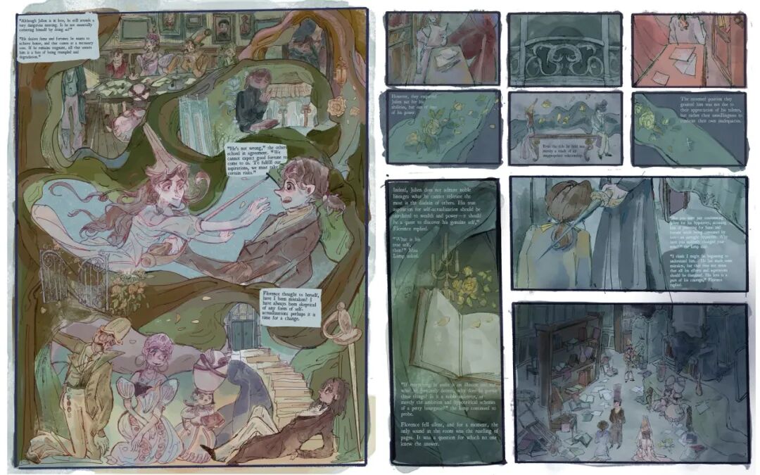 其中印象最深是一部12页的图像小说。灵感来源于《红与黑》的音乐剧,我设计了一个和《红与黑》主人公于连性格完全相反的角色,以他的视角来看待这个故事,反思自我价值在社会规范和个人理想之间的挣扎与动摇。他懦弱、自卑、冷漠、不善言辞,以一个如此平庸的视角去看待于连飞蛾扑火般的人生,更是以一个第三视角去回顾我之前在普通公立学校的那段日子里的困惑与自我怀疑。
