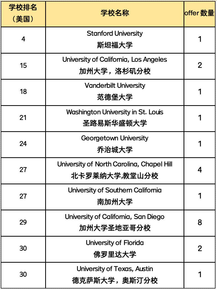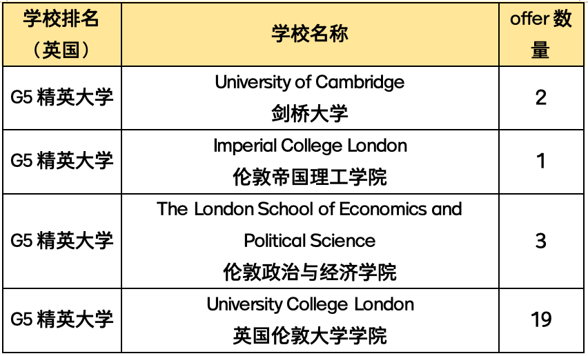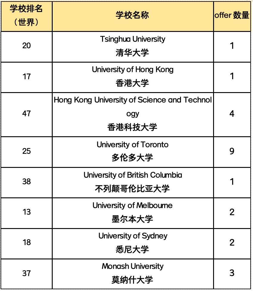 其中英国方向G5精英大学offer共 25封,美国方向TOP30综合性大学offer共22封,TOP40综合性大学offer共 55封,澳加港中国大陆等其他方向QS世界排名前50大学offer 共23封,录取专业涵盖数学、物理、化学、计算机科学、生命科学、神经科学、海洋科学、环境科学、城市研究、工程、建筑、文学、教育学、经济学、金融会计、心理学、传媒、艺术设计等众多学科领域与MORSE等诸多跨学科综合性专业。