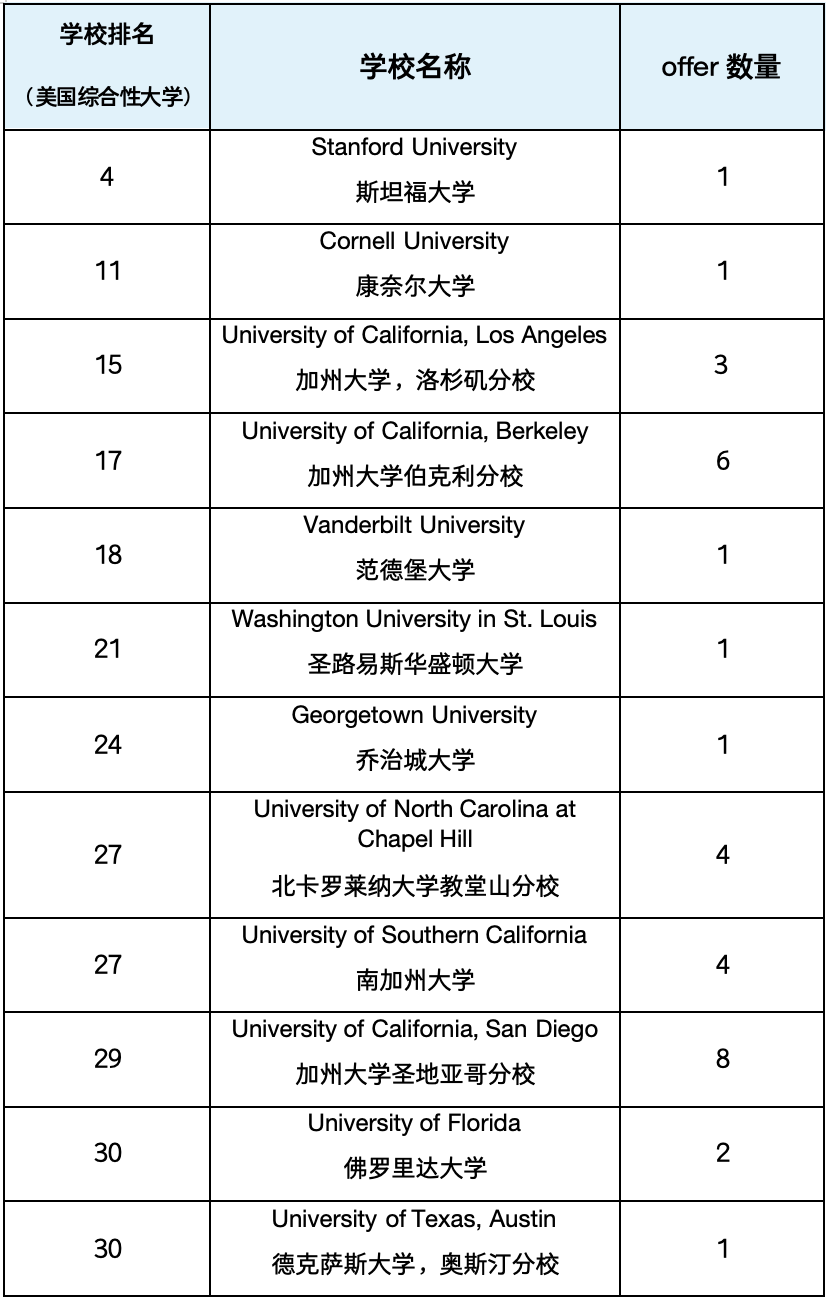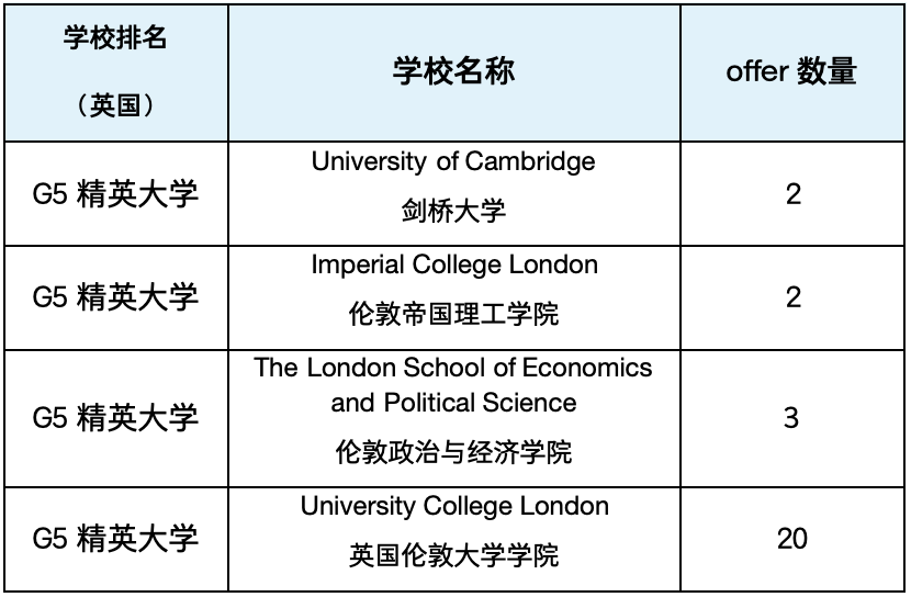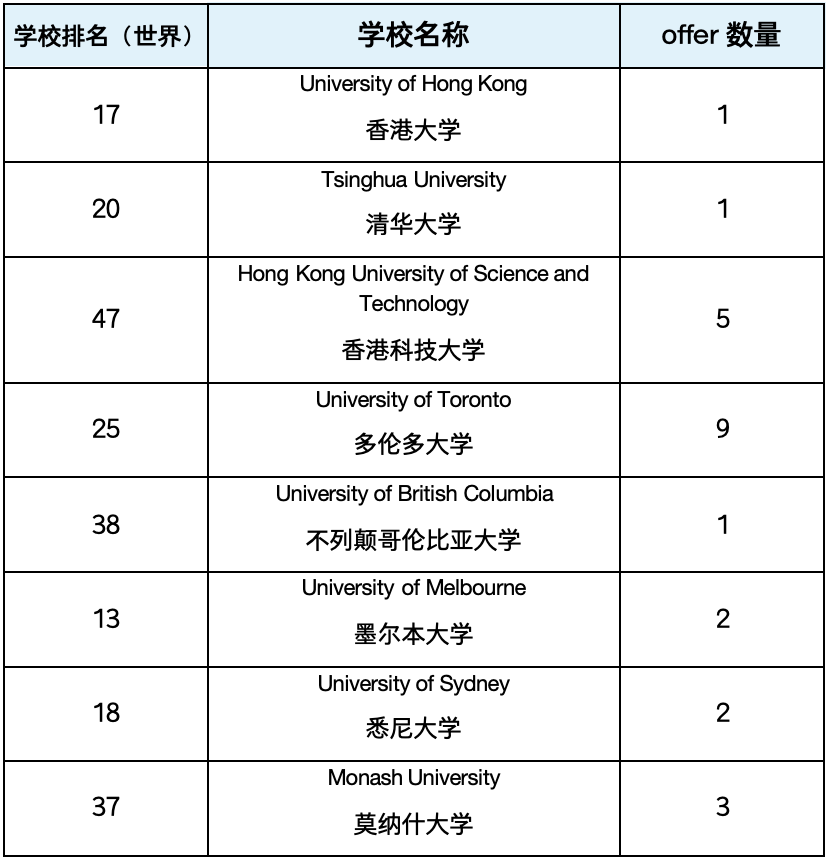 其中,英国方向G5精英大学offer共27封,申请英国方向的33名学生57%斩获G5,美国方向TOP30综合性大学offer共33封,申请美国方向的37名学生52%斩获TOP30,TOP40综合性大学offer共 85封,TOP40斩获率84%,澳加港中国大陆等其他方向QS世界排名前50大学offer 共24封,艺术方向罗德岛设计学院1封、伦敦艺术大学3封,录取专业涵盖数学、物理、化学、计算机科学、生命科学、神经科学、海洋科学、环境科学、城市研究、工程、建筑、文学、教育学、经济学、金融会计、心理学、传媒、艺术设计等众多学科领域与MORSE等诸多跨学科综合性专业。