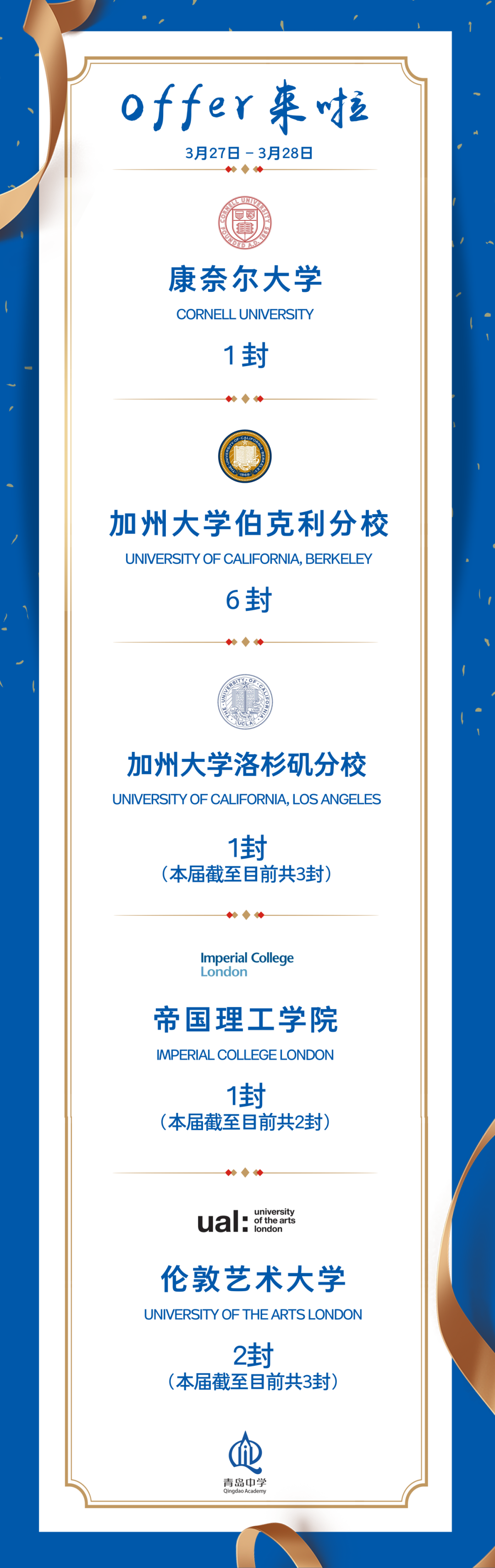 今天(Ivy Day)是美国常春藤盟校与多所顶尖公立大学放榜日,必威官方微博官网2025届毕业生再迎高光时刻,1封康奈尔大学、6封加州大学伯克利分校、1封加州大学洛杉矶分校的录取通知接连抵达,青中学子再次凭借过硬的学术实力和卓越的综合能力赢得了美国顶尖名校的青睐。
